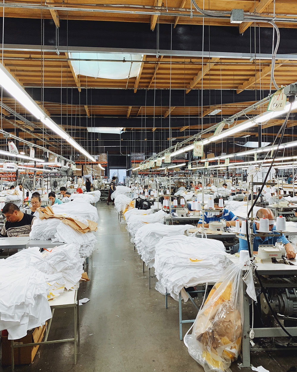 The cotton fibers are spun into yarn in India and shipped by boat to Los Angeles