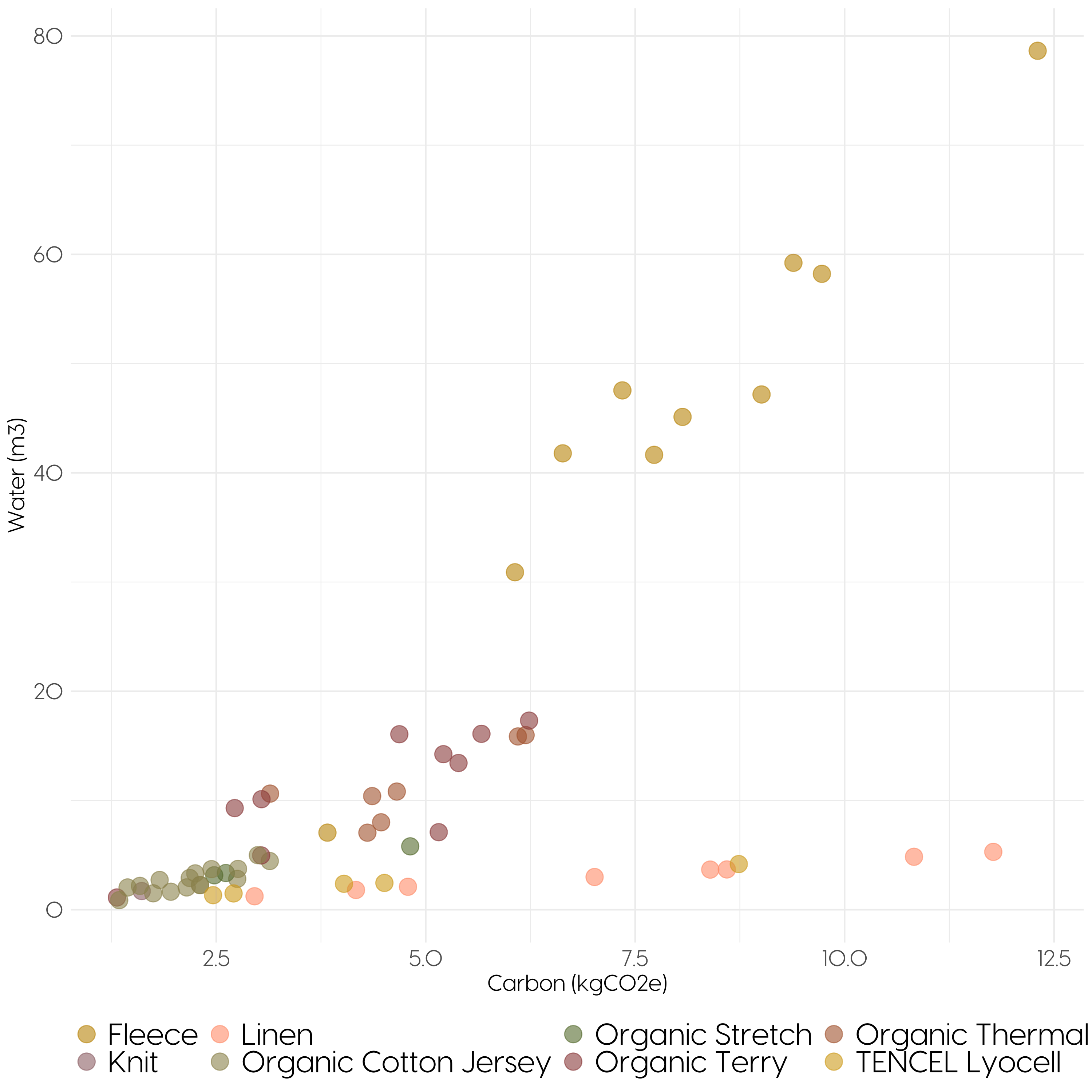 The following graph illustrates the carbon footprint (kgCO2e) and water impact (m3) of all MATE products color-coded by fabric. As you can see, a lot of the products made with the same fabrics have similar impacts.