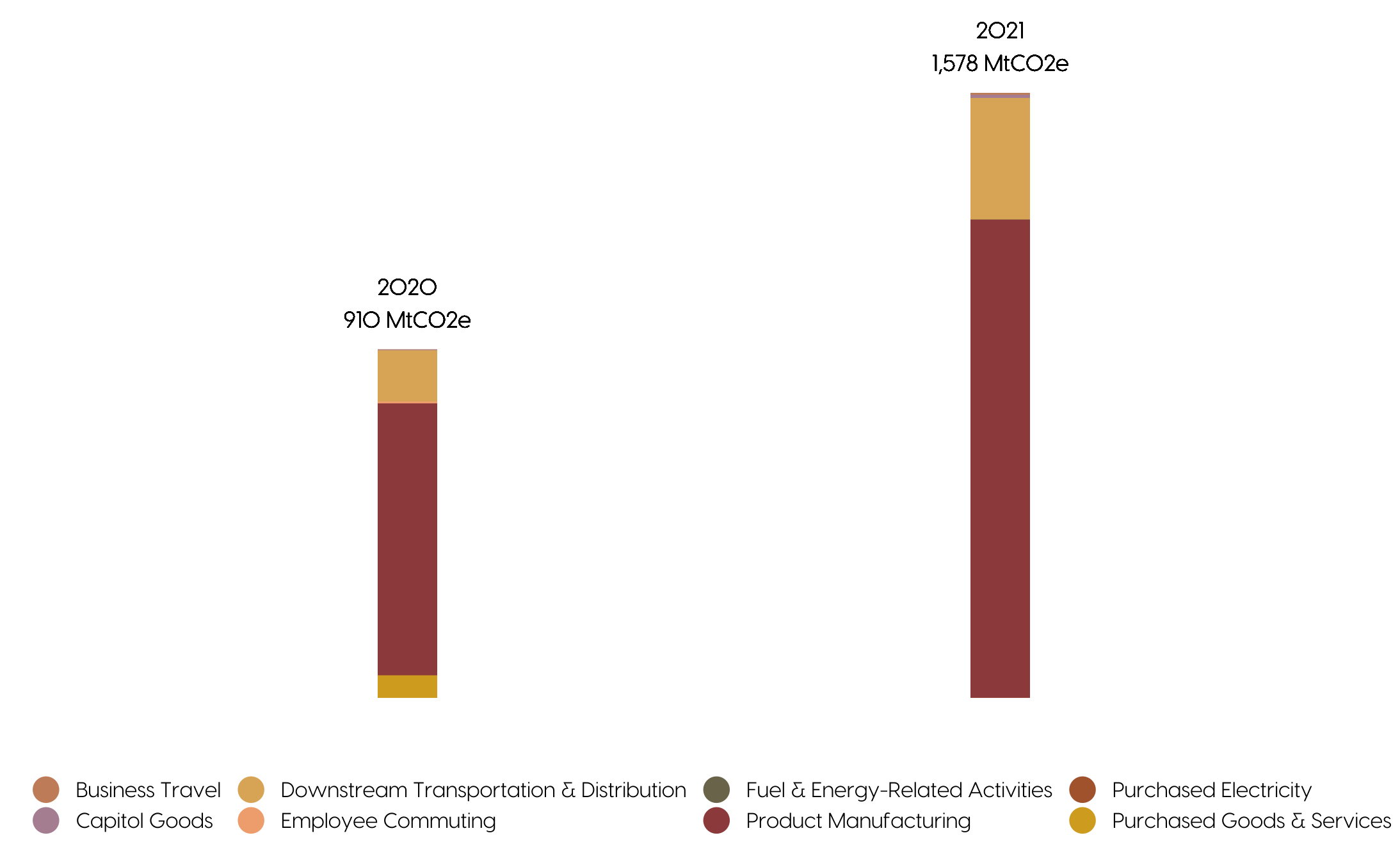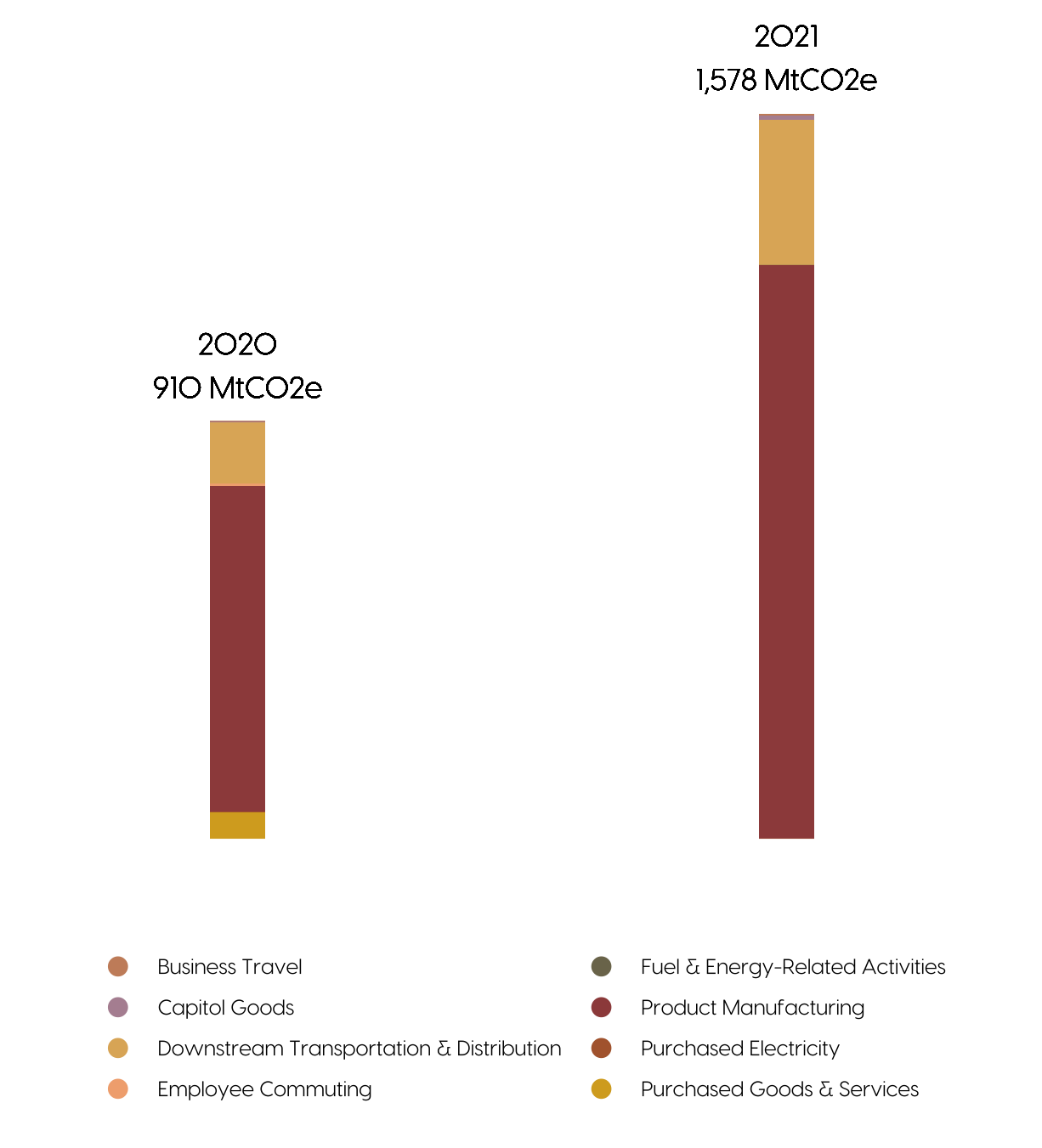 The majority of our carbon impact comes from making our products. Emissions from other facets of our business like our office, employee commutting, and business travel are small because we have a lean, mostly remote team.